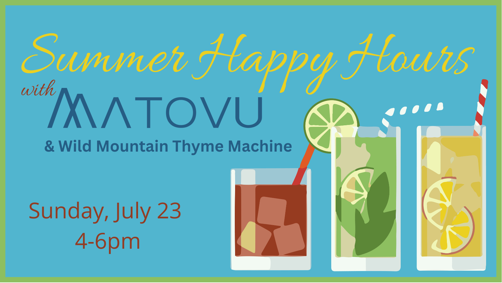 Come have a drink (alcoholic or non) at MaTovu, listen to live tunes from local band Wild Mountain Thyme Machine, and get to know our vibrant community better.