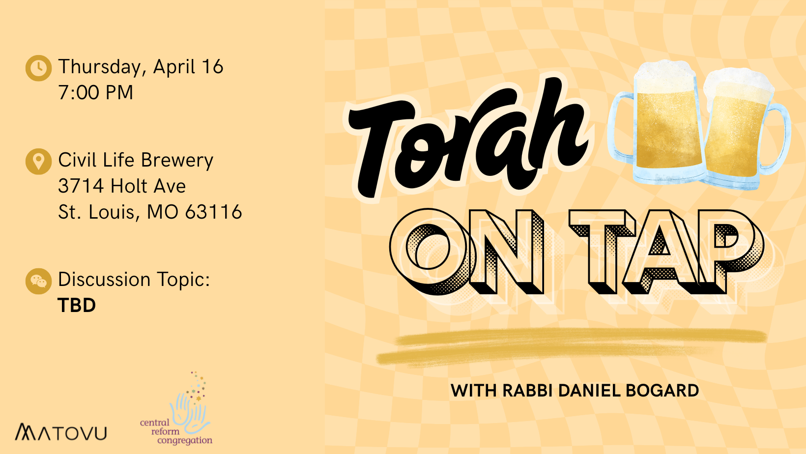 Join Rabbi Daniel Bogard and MaTovu at Civil Life Brewery for our next Torah on Tap! Torah on Tap is a program where we dig into Torah over brews in community locations. This month’s topic will be announced soon.